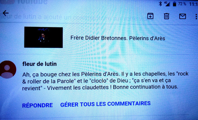 11jun19 209C13 Bien aimé Frère Michel, Ce petit mot — qui n'est pas destiné à une publication en commentaire pour votre blog — mais simplement pour vous prévenir qu'en voulant partager la vidéo des frères Éric et Frédéric, j'ai eu un avertissement à cause des extraits musicaux qui y sont repris, car il y a des droits d'auteurs dessus. Cela amène la cie Warner Bros à revendiquer la vidéo... du fait des extraits musicaux repris. Il vaudrait mieux en créer une ou y placer une musique libre de droits d'auteurs. Je vous souhaite un excellent Pèlerinage. J'ai le désir profond de venir au Val Anouka, mais cela sera probablement un Pèlerinage du cœur, car mes moyens ne me permettent pas de venir vous rejoindre sur le Lieu Saint. Je vous embrasse du fond du coeur, Danny G. de Belgique |