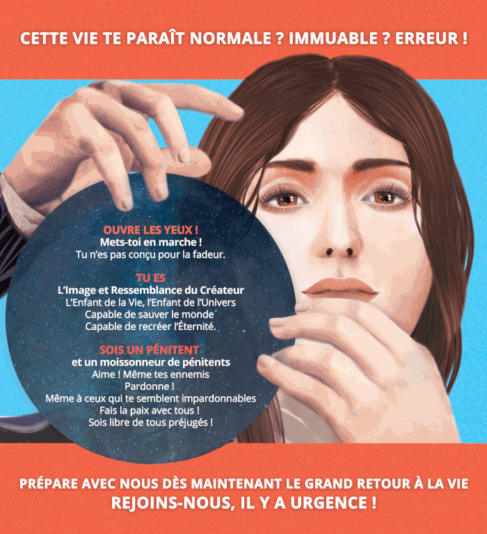 29fev20 216C22 Le Bien Est par Lui-même, fonde tout l'Univers ; c'est l'Être, Dieu, la Vie oubliée qui dort au fond de l'humain. Appelez Ça comme vous voulez ! Que fait le(la) pénitent(e) ? Il réveille cette Vie et La rend active parmi les hommes. Dans l'océan du Mal ordinaire, l'action pénitente ne représente qu'une goutte infime de Bien, reste pour le moment invisible aux yeux de la multitude, pourtant elle porte déjà "toute" l'Éternité et c'est là la singularité de son colossal Potentiel ! Le Bien absolu, donc universel, n'est pas une notion définie par une morale particulière, laquelle est toujours arbitraire, créant une aire de jugement d'où certains ressortent comme les "bons" et d'autres comme les "mauvais". Ce qui permet aux uns (les "bons") de condamner les autres (les "mauvais"), voire de les éliminer. La loi humaine d'un temps et d'un lieu donné ne fait qu'apposer son cachet légal à la morale arbitraire qui a cours dans les esprits, qu'elle entérine avec un système de coercition pour l'appliquer à tous : tribunal, police, armée... que se fera un devoir de commander un ego particulier, élu parmi des millions d'autres pourtant théoriquement égaux à lui, ego particulier dont l'orgueil est par là démesurément flatté. Ainsi, quel que soit le régime de gouvernance, chaque époque établit la dictature d'une loi, donc d'un "bien" particulier, issu d'une famille de pensée humaine particulière, incarnée par un roi, qui s'impose par le clonage massique d'une multitude de rois potentiels ! La démocratie actuelle n'étant que le trucage moderne où cette loi s'établit, du moins en théorie, au nom de la majorité de la masse, ce qui, sur le Fond, ne change rien à la dictature de la loi et du roi qui l'impose. C'est le système des idiots où nous sommes depuis Adam. La loi humaine, de fait, occulte et s'oppose au Bien, elle ne veut surtout pas de l'amour universel. Sans en être forcément totalement conscients, les tenanciers de la loi [Rév d'Arès 28/8, xix/24], princes et prêtres du système, veulent que le Bien reste en dormition car son réveil signerait leur disparition définitive. Le monde depuis la chute d'Adam a toujours fonctionné ainsi, selon un arbitraire moral particulier, se privant de la ressource des déviants, fous, contestataires, objecteurs, artistes, révoltés, saints, mystiques... de tous bords, de tous ceux qui sont mal à l'aise avec lui, dont l'existence même lui posent une question métaphysique centrale, sur l'Être et la raison même de l'homme sur terre. Le "bien" particulier institué du moment se défend de ses contestataires, justifie sa répression, au nom de l'apparence de paix stable qu'il représente (jusqu'au jour où il déclare la guerre), mais il n'est en fait qu'une pacification provisoire et apparente du Mal par la terreur de sa contrainte uniformisatrice. Il n'est en fait jamais qu'un camp retranché particulier de la grande ligne de front de la guerre cosmique déclarée par l'homme-Dieu à sa propre Nature, au Bien, guerre qui tisse le temps humain. Le problème est que les rebelles en question ne sont en général pas plus conscients du Bien Universel gisant dans tous que l'ordre en place ne l'est et qu'ils ne préconisent qu'un remplacement des uns par les autres (eux). Et plus personne ici-bas n'en saurait rien si Dieu Lui-même ne prenait pas la peine d'en avertir ses Enfants, de tomber depuis les Ciels à la face d'un homme pris comme représentant de tous les autres : le prophète (Rév d'Arès xxxii/13). Le juge, le compte coule (de lui) (Rév d'Arès xi/3) : Du jugement des hommes en fonction d'une morale particulière, donc d'une idée du bien non universelle, ramenée à des intérêts particuliers, à un peuple ou à une classe sociale particulière, ressort un ordre arbitraire, ce que Dieu désigne par le compte. Le compte [en fait : le bruit] tourne les meules (Rév d'Arès ii/13), disperse nos esprits jouant de la si courte vie humaine : c'est là toute notre histoire, autrement dit la perpétuation du péché, du même, prenant des apparences changeantes mais ne changeant pas la vie ; l'homme pécheur se prolonge et se perpétue dans les images mouvantes de son rêve, rassuré par sa religion, son idéologie, le menteur (iv/6). L’homme compte, l’homme compte ; le rêve cache la nuit (Rév d'Arès ii/14) Activer le Bien consciemment, autant que faire se peut pour chacun(e) par : amour, paix, douceur et mesure, autrement dit être pénitent est la seule manière de changer le monde (Rév d'Arès 28/7) pour de vrai comme disent les enfants, ou pour de Bon, au sens propre. Sinon on perpétue l'Histoire, c'est-à-dire l'humain tournant en rond dans la cage invisible qu'il s'est lui-même créée, et qu'il ne cesse d'entretenir par ses croyances, son péché et son ignorance Qu'il est lui-même Dieu, cage bien réelle dont il souffre, où il finira par étouffer et risquer de disparaître à jamais — Péché des péchés (Rév d'Arès 38/2). Sauf s'il sort de la cage ! Et sortir de la cage c'est vouloir se refaire Dieu, se transfigurer, c'est tout simplement individuellement entrer en pénitence et collectivement en faire un Projet social transcendant l'histoire et le temps. Claude M. d'Île de France |